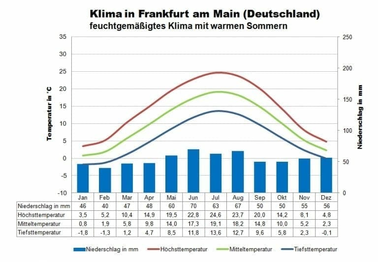 Verschaffen Sie sich vor dem Kauf einer Heizungsanlage erstmal einen Blick über die klimatischen Verhältnisse in Frankfurt. Eine grobe Übersicht zeigt das folgende Schaubild.