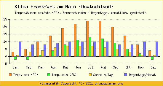 Verschaffen Sie sich vor dem Kauf einer Heizungsanlage erstmal einen Blick über die klimatischen Verhältnisse in Frankfurt. Eine grobe Übersicht zeigt das folgende Schaubild.
